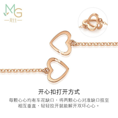 采用爱心扣设计,表达两个人的心相互交织,相互倾诉心声。结合开心扣打开方式,拉开即可解开双环心,使其容易佩戴。