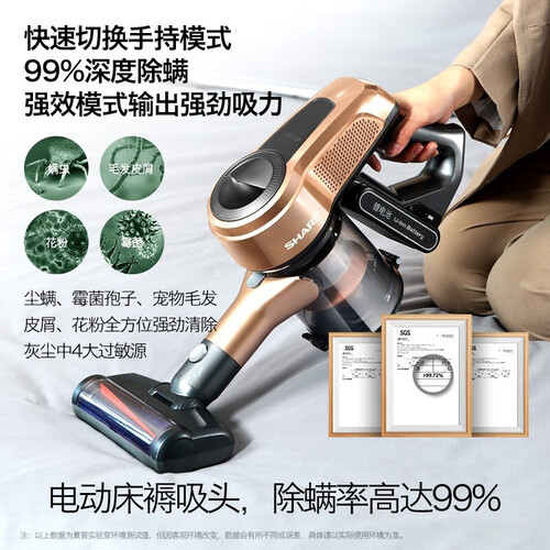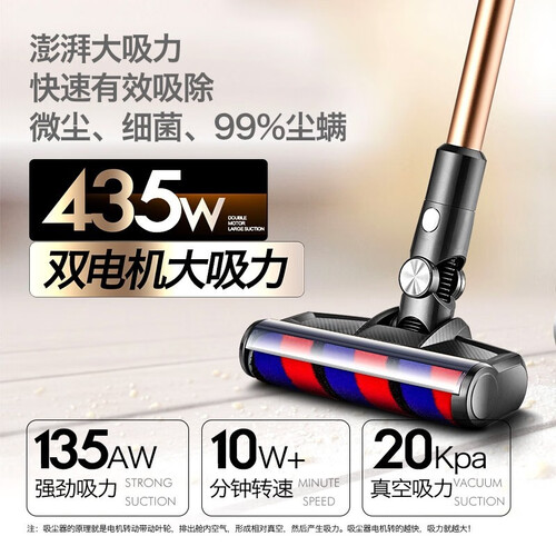 整机功率高达435W,强劲吸力可快速洁净地面尘屑。可以快速切换手持模式,去除99%的螨虫,强劲清洁一吸即见。