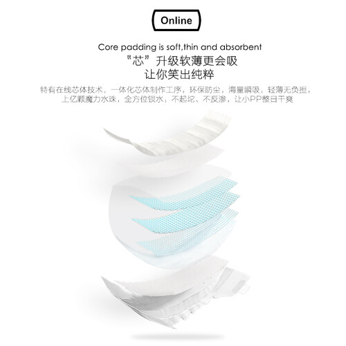 底层添加细旦纤维材质,能够时刻呵护宝宝的娇嫩肌肤,触感更柔软。在线芯体技术,快速吸取尿液,干爽舒适。