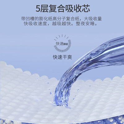 带凹槽的膨化纸高分子复合纸,大吸收量快速吸收,整夜安睡。面层采用多肽抑菌材料,有效防止宝宝红屁屁。