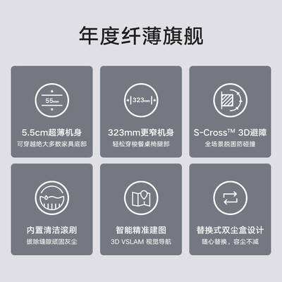 5.5cm超薄的机身设计,不占用过多家庭空间,并且可以轻松完成隐藏角落的清洁。内置滚刷设计,毛发也能快速清理。