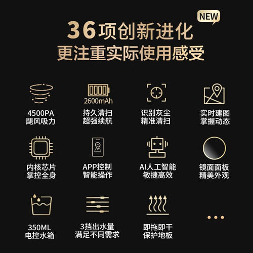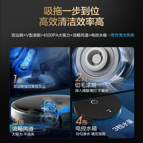 这款扫地机器人采用飓风大吸力配置,可有效吸附微尘。扫拖一体的设计,让卫生清洁更加彻底。