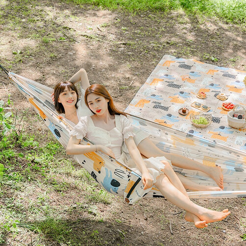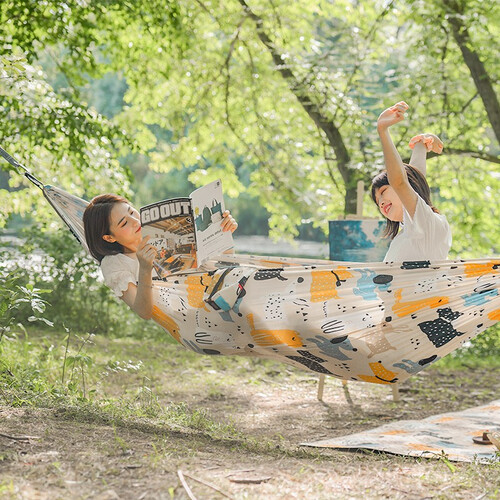 此款吊床采用了加宽设计,使用时能贴心防止侧翻,非常的安心;涤纶加粗绑绳配以金属登山扣,牢固又稳固。