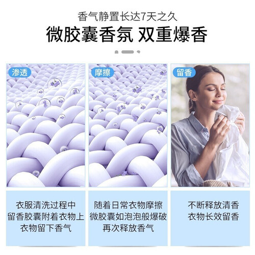 纳米微胶囊留香因子,释放天然香气,延长留香时间;两种香型,可自由搭配使用场景;200g大容量,可使用时间更长。