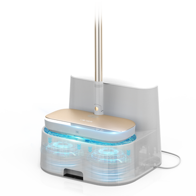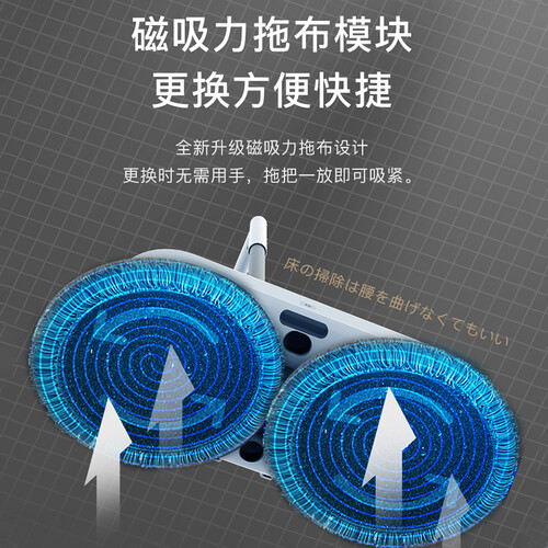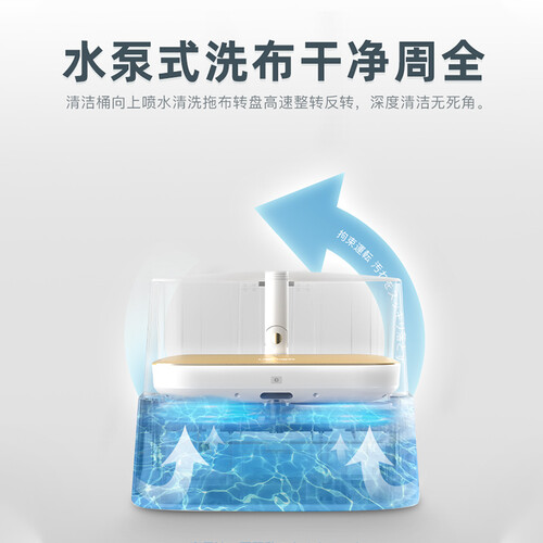 采用水泵式洗布的方式,清洁桶向上喷水清洁拖布,转盘高速转动,清洁更干净。搭载磁吸力拖布设计,更换时无需用手,更方便。