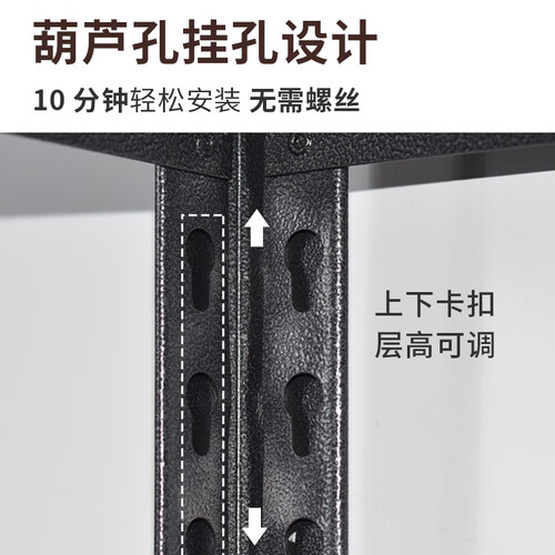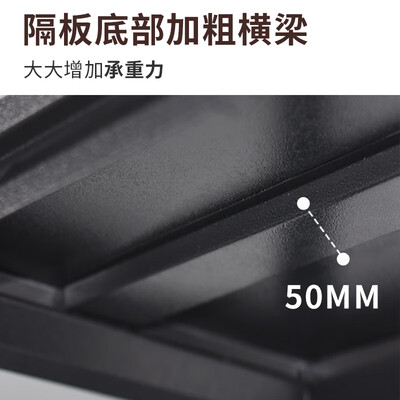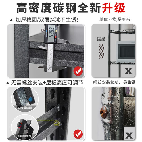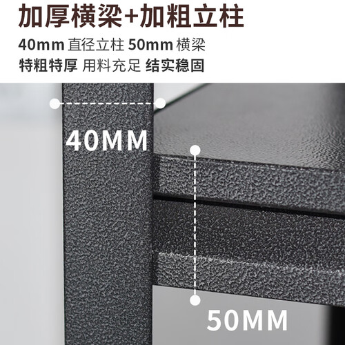 加厚的碳钢结构置物架,黑色的外观质感出众,颜值与实力俱佳。横梁与立柱的加粗设计,带来出色的置物体验,不易晃动。