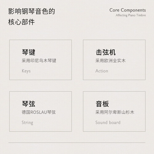 采用印尼乌木琴键,光滑易按,弹奏速度更快。选用德国ROSLAU琴弦,坚韧耐拉断,使用寿命更长。