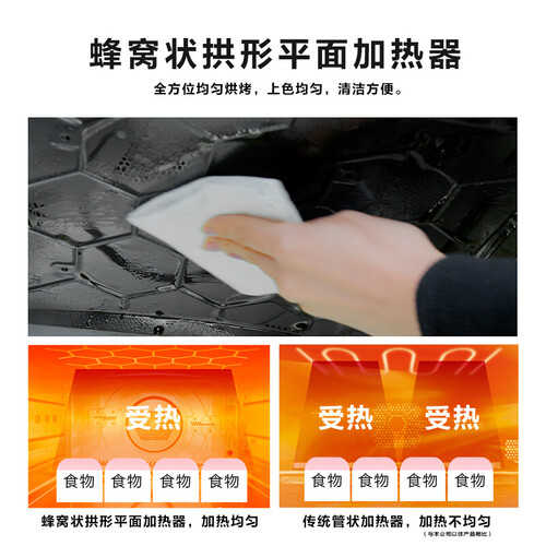 精心设计蜂窝状平面烤,可全面均匀烘烤,上色更均匀,加热器与内循环风扇配合,食材受热均匀,酥脆可口。