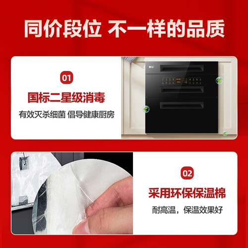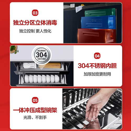 使用304不锈钢食品级材质,耐腐蚀,不易生锈,不含重金属,使用更安全。独立分区消毒,而后高温烘干,防止餐具受到二次污染。