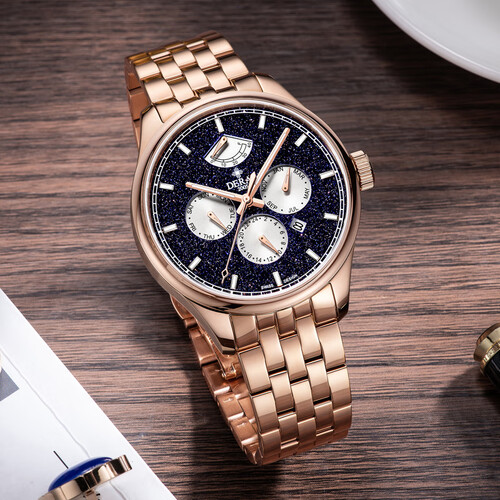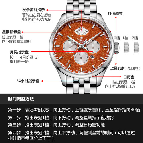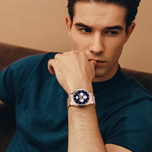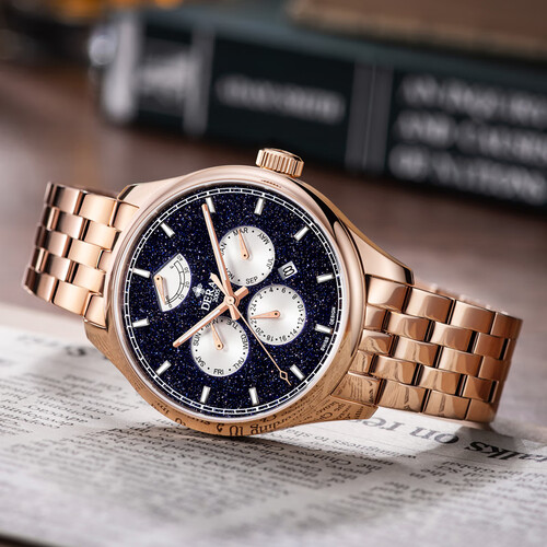 配备手动快速日历设定,调时方便,简单快捷,迎合都市快节奏生活。搭配双按蝴蝶扣,单手即可轻松开合,佩戴舒适不勒。