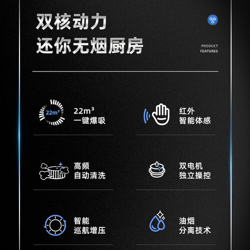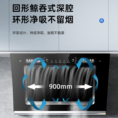 双核铜质电机设计,独立对准炉头,再大油烟也无惧怕。国家标准二级能效,强吸力同时耗电量更低,节省用钱。