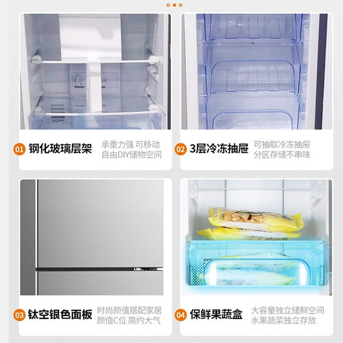 风冷免除霜,制冷快速均匀,食物不风干不粘连,保鲜不结霜。强冷动力,为食材迅速锁住新鲜营养,让你畅享食物原鲜。