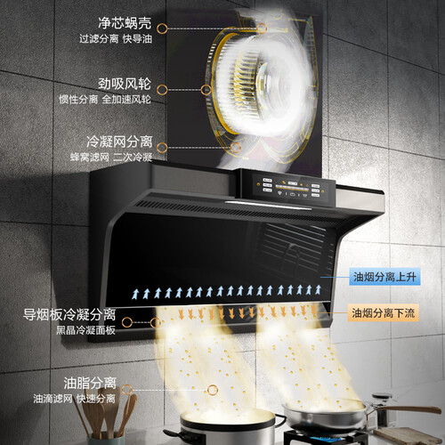 顶部和侧面同时吸附油烟,避免四散的麻烦,保持厨房的整洁。燃气灶具备定时功能,无需守在锅旁,时间更自由。