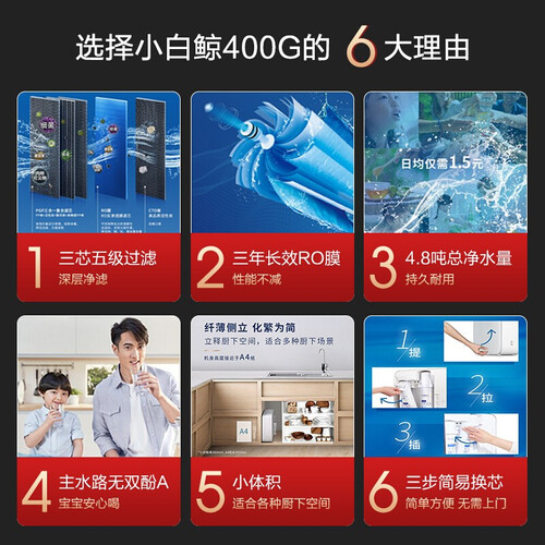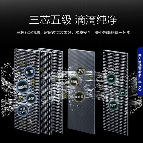 三芯五级深层净化,提升水质纯净度,告别多余有害物质。长效RO反渗透滤芯,多层次过滤,延长使用寿命。