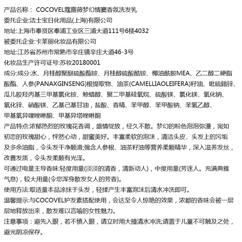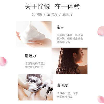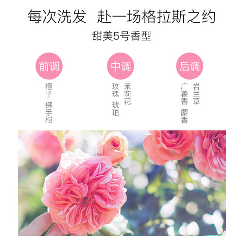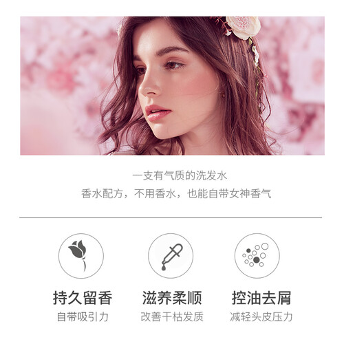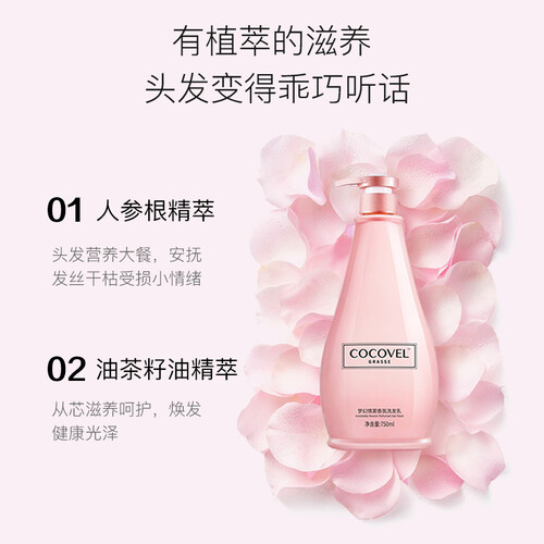 香水配方,洗发的同时散发优雅迷人的香气,留香持久。富含人参根精粹以及油茶籽油精粹成分,营养成分深入发芯。