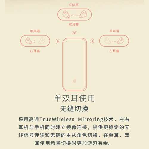 采用APTX音频解码技术,能够实现CD般的高品质音质,无损播放效果好。支持单双耳使用,切换速度快,使用更灵活。