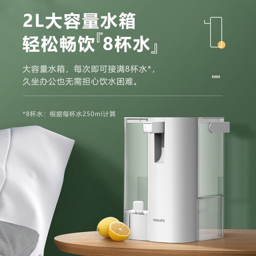 小巧便携的设计外观,放入包包里刚刚好不会占用过多的空间。侧方式的进水设计,可防止倒水的过程中饮水机倾倒的发生。