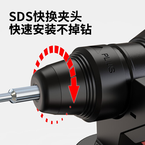 采用SDS快换夹头,安装时简单省力,牢固性好,不会掉钻。安全离合,遇到钢筋等坚固物体会自动停止,保护钻头。