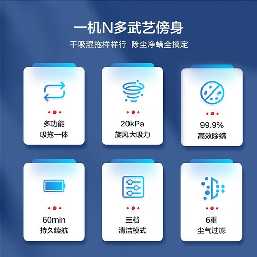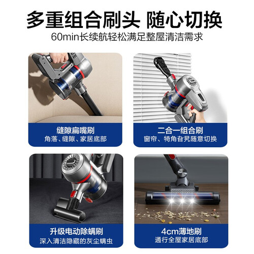 内置真空大吸力的加持,常见污渍轻松搞定,全屋深层清洁无压力,吸力更持久。轻量化设计,举高清洁也舒适。