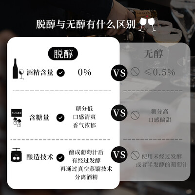 采用葡萄经过发酵窖藏以及陈酿而成,口感以及颜色都是非常好的。脱醇制作,糖分较低,清爽香气浓厚。