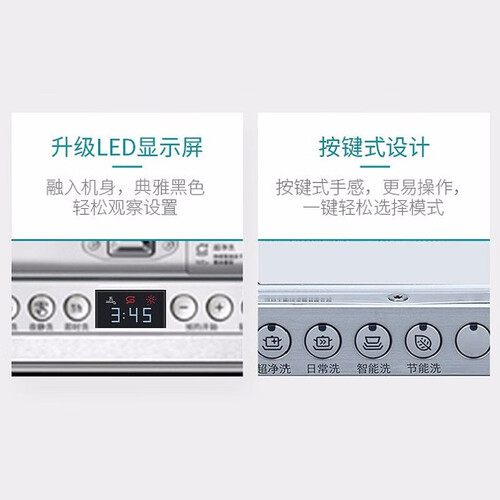 按键式设计,易于操控,一键即可选择洗涤模式,轻松应对油污。5D智能洁净系统,动力强劲,轻松冲洗餐具上的油污。
