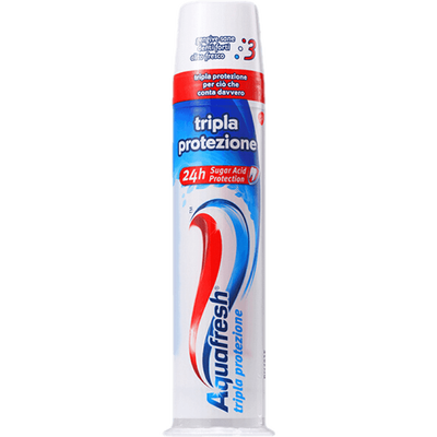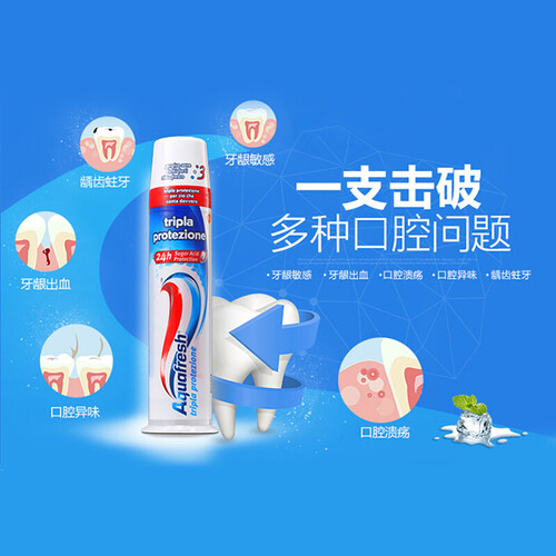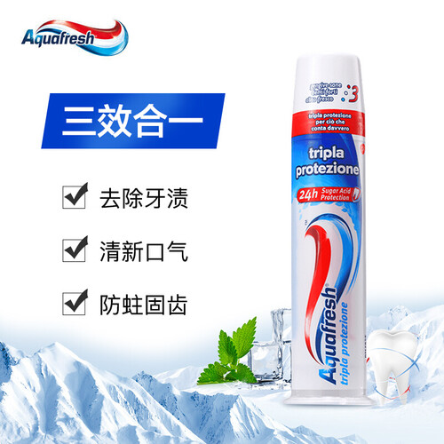 拥有三种颜色,蓝色可以清新口气,白色含氟,可以预防龋齿,更坚固牙龈,红色特有清洁成分,可去除顽固牙菌斑。