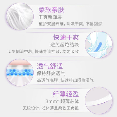 轻薄舒适的芯体,无胶成分,柔软舒适穿着无负担更放心。U型导流技术,快速吸收尿液,持久干爽不闷热不断层。