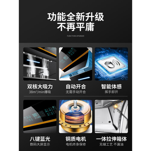 智能体感操作,挥手控制即开机,轻松调节风量大小,操作简便。双电机设计,轻松应对煎炒烹炸等油烟,放心烹饪无油烟困扰。