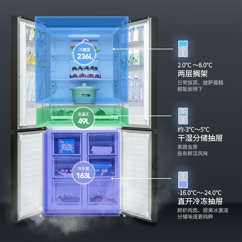 采用360度循环立体出风,做到制冷快速均匀,更好的锁住食材的新鲜。风冷无霜,告别传统冰箱反复除霜的烦恼。