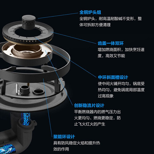 124mm大路头设计,燃烧面积广泛,受热更加均匀,有效防止糊锅。搭载聚能环设计,有效防风稳焰,燃烧更稳定。