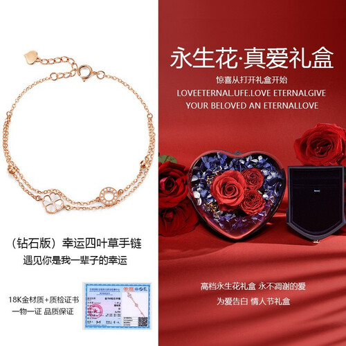 设计的灵感来源于四叶草,寓意拥有幸福,镶嵌优质白母贝,纯洁典雅。包装搭配红色玫瑰花,用心搭配,给人热烈浪漫的感觉。