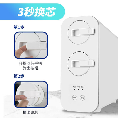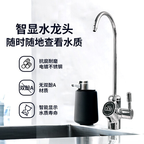 搭载RO反渗透膜滤芯,0.0001微米过滤精度,8秒一杯鲜活水,更健康。配有智显水龙头,水质TDS值可实时显示。