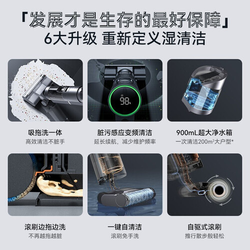 内置独立马达驱动,推动前行,帮助节省力气。可自动感应脏污程度,带来变频清洁,有效延长续航,减少机器的维护频率。