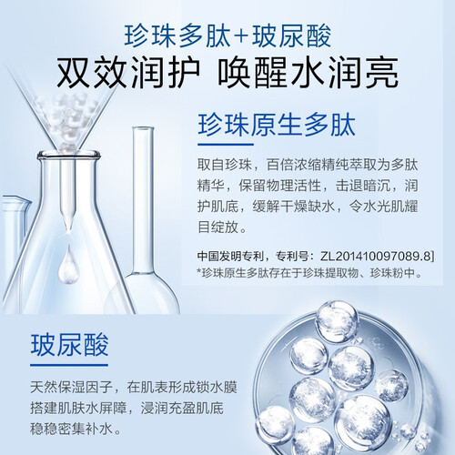 融入天然珍珠提取物,保留其物理活性,加速肌肤吸收,深层提亮滋养。添加玻尿酸成分,保湿美白同步进行。