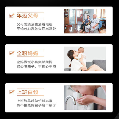 内置感应探头,出现干烧意外自动切断气源,保证烹饪安全。180分钟定时,根据食材随地设定时间,到时自动提醒,使用省心。