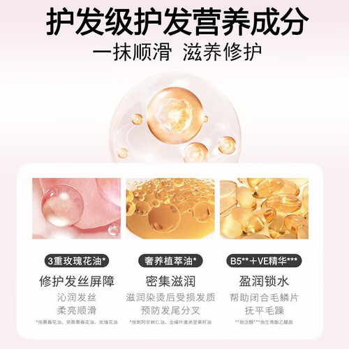 三重玫瑰花油&VE精华,升级配方顺滑闪耀,能长时间保持头发湿度,并使头发柔软而浓密。香水香型清静幽雅,更添雅致欢快。