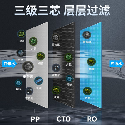 无罐机身小巧不占地,小厨房也能释放更多储物空间,厨上厨下自由摆放。三芯三级过滤,无异色、无异味,纯净直饮。