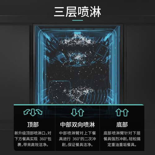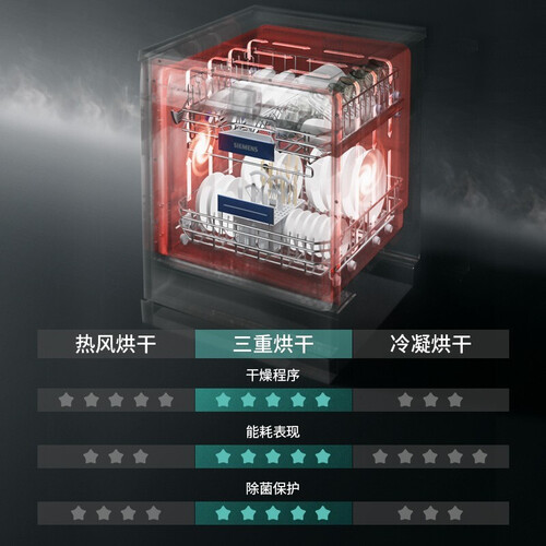 五大智能洗涤程序,根据餐具的脏污程度,触控面板一键清洁。强劲冷凝烘干,配合热交换持续高温赶走湿气,提升烘干效果。