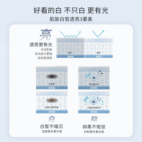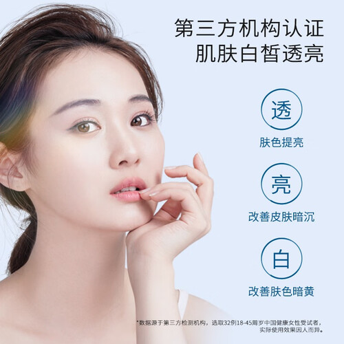 以烟酰胺为主要美白成分,有效改善肌肤暗沉粗糙。成分安全温和,持有国家美白认证。质地轻盈不黏腻,涂抹易吸收。