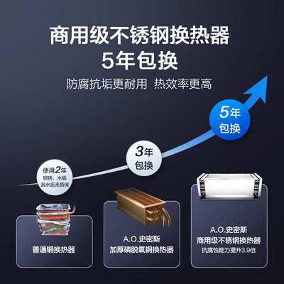 采用商用级不锈钢换热器,具有优良耐腐蚀性能,且换热效率高,严格防止出现久用漏水的情况。可进行微火燃烧,夏季使用不烫人。