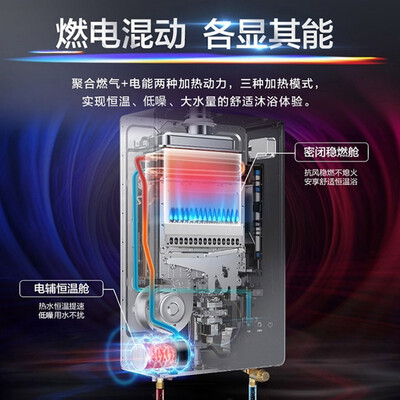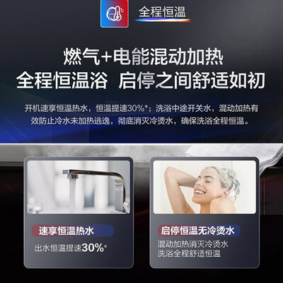 聚合燃气和电能两种加热动力,三种加热模式,实现恒温低噪大水量的体验。出水恒温提速30%,速享热水。