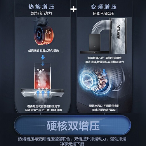 直驱变频双增压,可以双倍提升排烟动力,强劲排烟。体感智控,只需要挥手便可以开关机,无需触控,烹饪过程不脏手。
