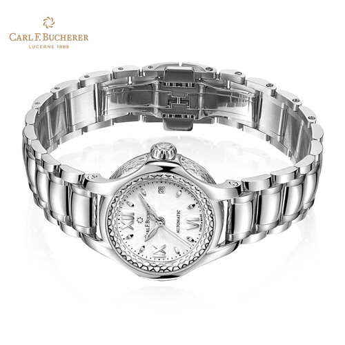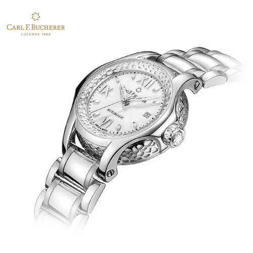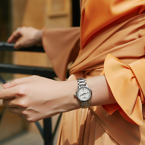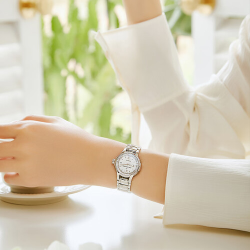 表圈与表壳装饰雕花,增加层次立体感,打造时尚新颖读时。结合精钢表带,不易出现划痕,随意活动不惧日常磨损。