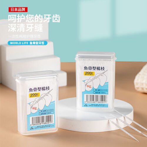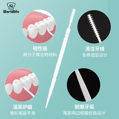 高分子聚合物材料牙线,健康环保,没有任何的异味。尾部两侧具有粗糙的纹路设计,可以去除牙齿的污垢。
