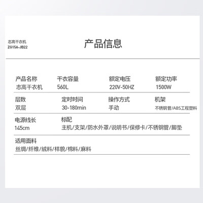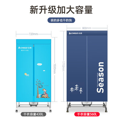 1500W功率设计,达到快速烘干衣物效果,无惧潮湿天气。容量560L,满足全家烘干衣物需求,配安全保护系统,使用更放心。