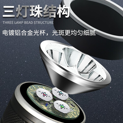 电镀铝合金光杯,不易损坏,搭配内部三灯珠结构设计,让光照更细腻,视觉效果更清晰,且自带充电指示灯,设计很贴心。