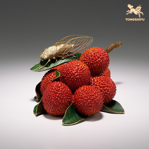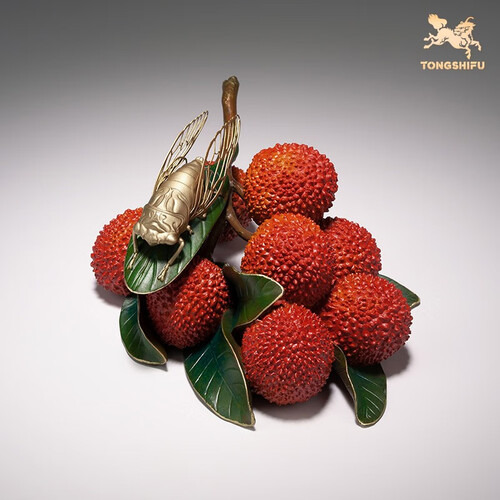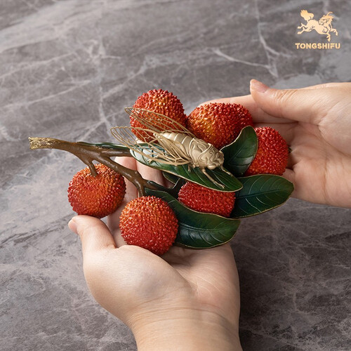 采用优质黄铜为原材料,质感醇厚结实耐用。使用高温着色工艺,色泽光亮细腻,做功精美使蝉和荔枝灵巧生动。