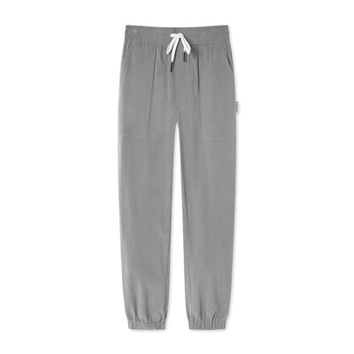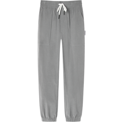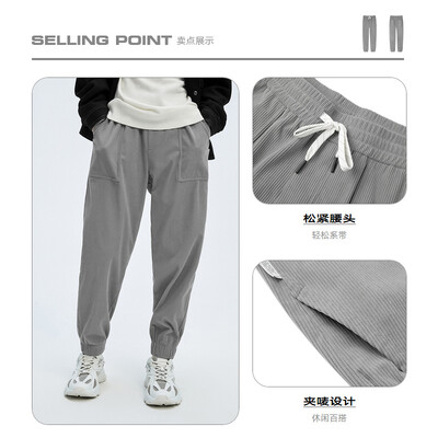 休闲裤裤型标准,穿着舒适,腰部抽绳前卫潮流,工装风口袋、浅灰色更显年轻时尚,100%聚酯纤维面料,更加轻盈柔软,坑条肌理增添质感。