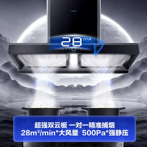 一对一双控垂直吸,让两股油烟各走各的路,提升通行效率。28m³强劲吸力,让您在开放式厨房中也能煎炒烹炸。