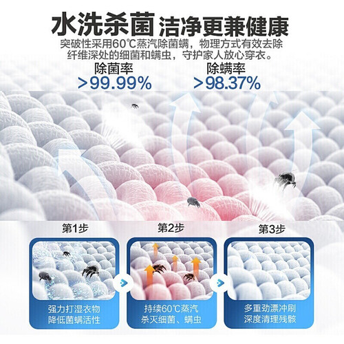 微蒸汽空气洗,无需水洗,轻松除菌,让细菌螨虫不再威胁家人健康。智能蒸汽烘技术,不担心阴雨雾霾天,外出不久等。